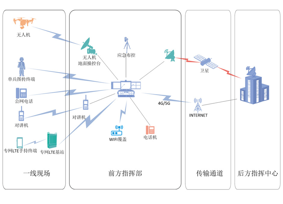 现场应急通信系统,集融合接入、音视频合成、视频会议、可视操作等功能于一体,实现各种短波/超短波电台、模拟/数字集群、公网电话之间的互通,可充分利用应急现场人员不同种类、不同网系的通信手段,快速构建现场临时通信指挥体系,并可与后方指挥中心互联互通。适用于政府应急、公安指挥、警卫指挥、消防救援、军事训练、抢险救灾等应急场景。