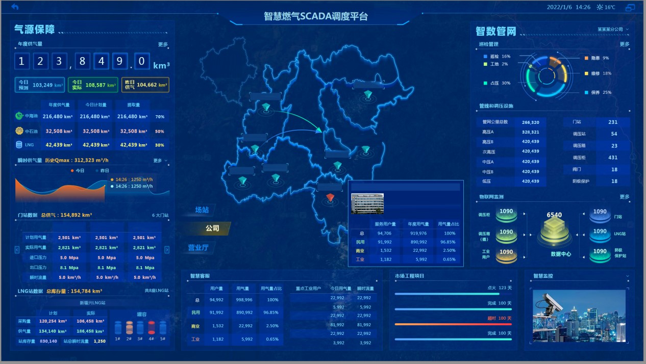 汇聚燃气管网资源管线(高、中、低压)、场站、调压站/箱、加气站、管网巡检人员、车辆等全业务场景信息,挖掘燃气管网安全运行核心业务数据,实现隐患分析和预警管控,可视化管理监控管网生产参数(流量、压力、温度)变化、设备状态变化、巡查人车位置与运行轨迹等,保障燃气管网安全运行。